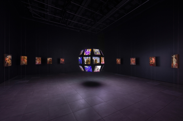 At the centre of the exhibition is Peace Core (sphere), 2024, a video work of infinite duration produced in collaboration with Annika Kuhlman. The rotating sphere of screens uses a purpose-built AI algorithm to endlessly re-edit and remix that fateful morning’s television footage and its accompanying sound. The accompanying 12 paintings are composed using a neural network trained on the work of generations of some of Sri Lanka’s most well-known artists who were influenced by the European modernisms first brought to the island by British settlers. Despite their seemingly different forms and subjects, the video installation and paintings are deeply interwoven—linked through ongoing political ripples and questions of image circulation and suppression, whose history is told, and which narratives are remembered. The exhibition brings together two ground zeros—one that was witnessed by billions in real time and another that occurred in its aftermath but went unwitnessed by the outside world.
