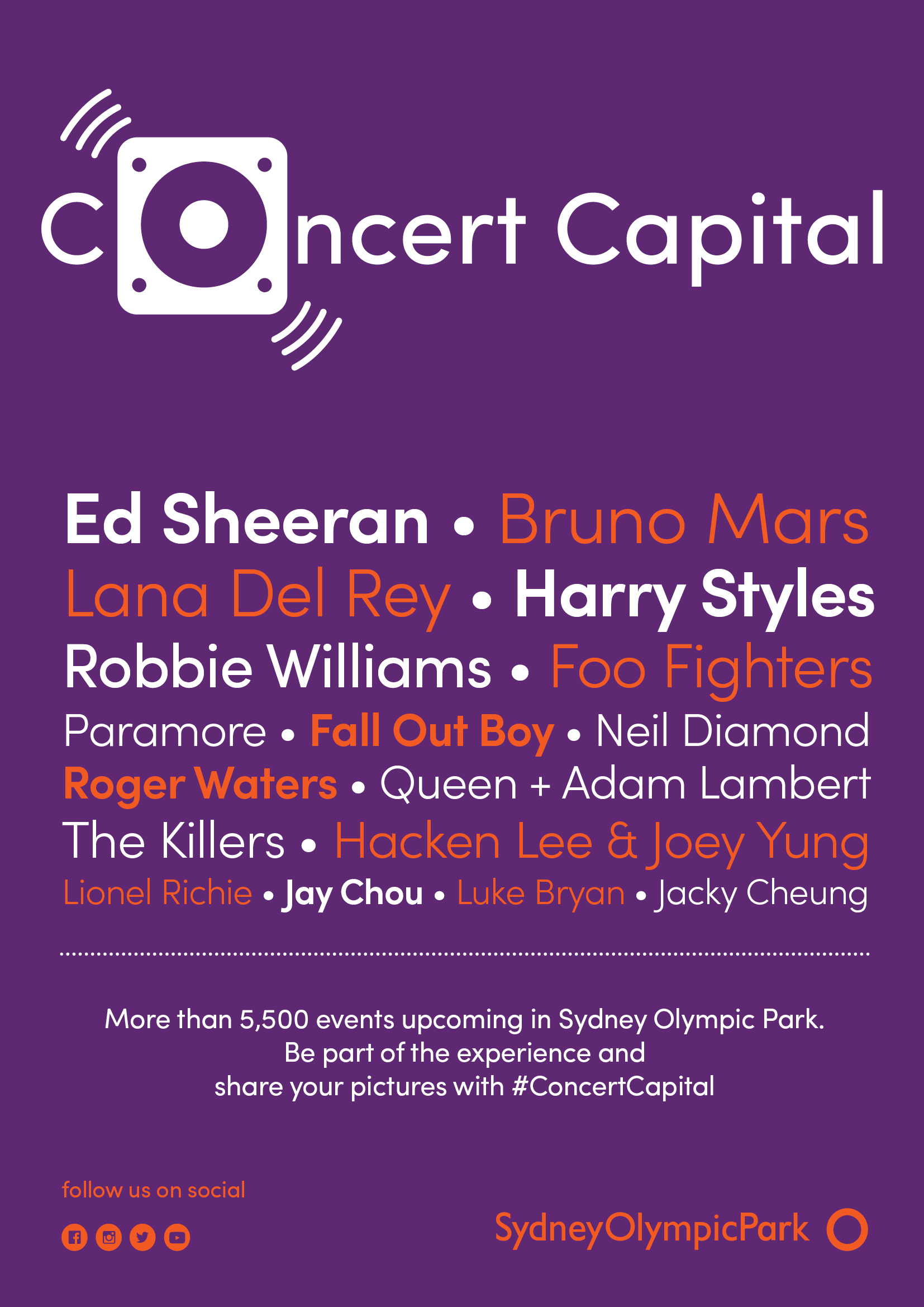 The #ConcertCapital line-up of superstars set to perform at Olympic Park's Qudos Bank Arena and ANZ Stadium includes Ed Sheeran and Bruno Mars (on the same night), Lana Del Rey, Harry Styles, Robbie Williams, Paramore, Fall Out Boy, Roger Waters, Queen + Adam Lambert, The Killers, Hacken Lee & Joey Yung, Lionel Richie, Jay Chou, Luke Byran and Jacky Cheung.