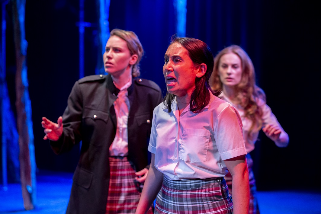There are other problematic elements with the script that diminishes its potency as a satisfying thriller. Many of the scenes presented in the play, whilst faithful to the lines in the book, often feels like a cut and paste job of randomly selected moments from the novel. Granted, many scenes have been omitted for brevity, however, it also lacks a cohesive narrative to explain the motivations and relationships between characters. Also the costuming is rather inconsistent, with the descriptions of the schoolgirls’ uniforms (delicate white dresses) is a complete mismatch with their contemporary starchy uniforms. Whether this is a deliberate choice by the director (Sahn Millington) to try and ‘modernise’ the play is unclear, as later Irma Leopold (Audrey Blyde) appears in vintage garb to indicate her status as a perfumed heiress, but the headmistress (Megan Bennetts) always remains in her schoolgirl uniform. The character of Michael is appropriately outfitted in Englishman’s attire, and whilst wonderfully played by Alice Birbara, it is a complete mismatch to his companion Albert (Sarah Jane Kelly, playing each of her assigned roles with long blonde locks), whose only hint of her role as the Aussie coachman is a hammy bogan accent and lots of man-spreading. Perhaps again, this is a feature of “modern theatre” to rely only on caricature for certain characters, but one cannot expect the audience to make a leap of imagination if they are not familiar with these supporting characters in the first place.