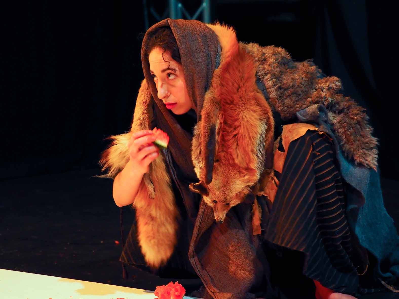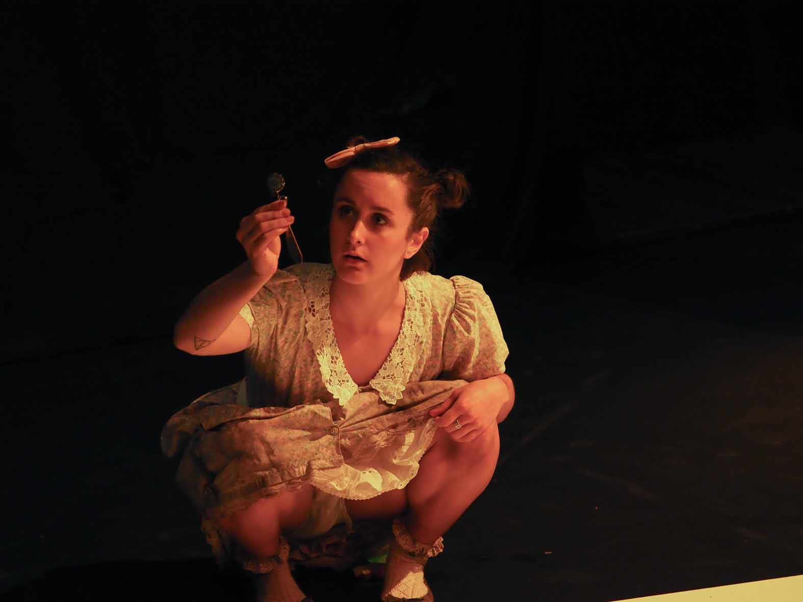 The culmination of all scenes is when chaos ensues and numerous ad hoc characters make pithy appearances including a salesman for hymens, a male porn star, a mother whose child is writing short stories about cellulite and thigh gap, as t-shirts with feminist slogans are thrown into the audience: the theme that women are constantly bombarded and overstimulated with messages on how to be; the sad denouement of which is how it all got to this?
