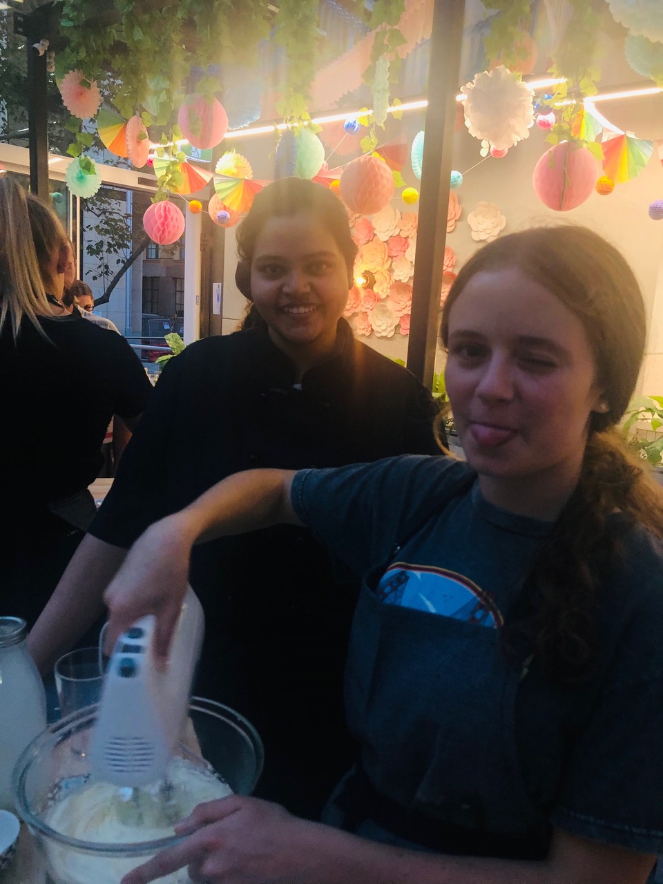 The delightful, energetic hostess of the mostest lead us through what to expect …and it was all whisks ablazing: cake mix, pots, pans, chocolates and laughs flying everywhere. Every team had to have a name encrypted with icing on chocolate: we called ourselves Pink Eye, and every team had to choose what they were going to make: we chose vanilla muffins, with vanilla topping drowning in candy.