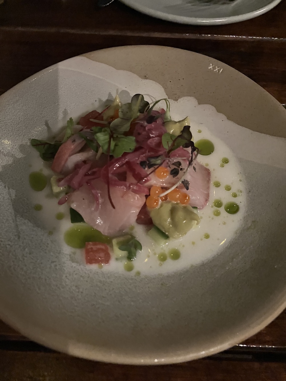 Kingfish aguachile, coconut, watermelon, baby cukes, avocado, Ora King Salmon roe GF/DF