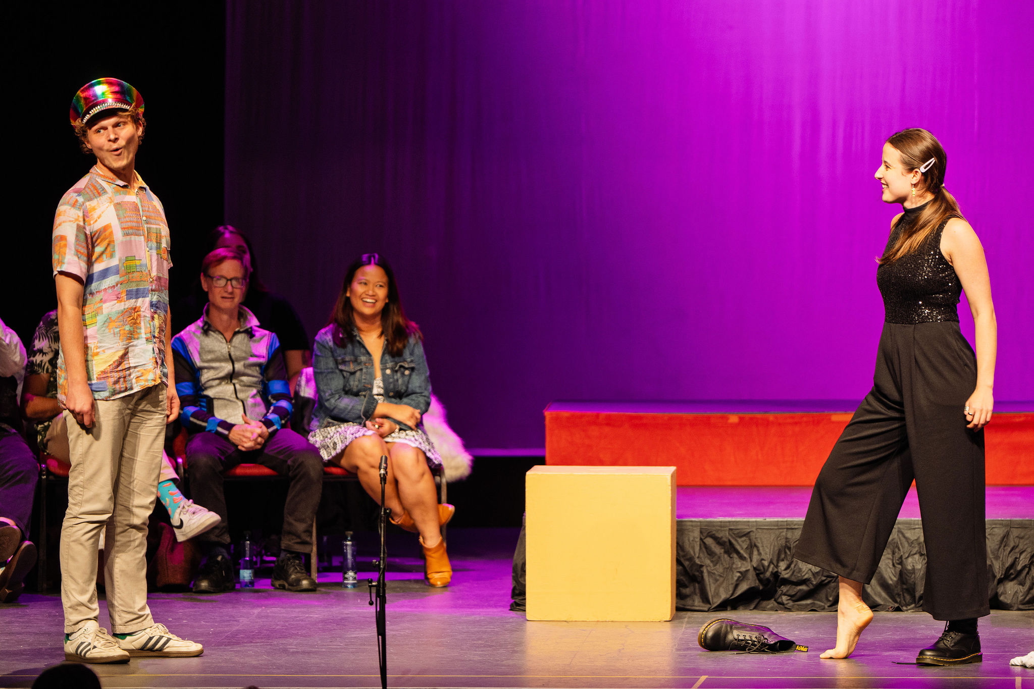 - Audience participation hit an all-time high when Taylor and Max were drafted to provide live sound effects for an escape room scene. Think tap dancing, Bavarian clocks, strange squeaks, and ominous time calls. They nailed it… almost. If only they’d remembered one actor’s squeaky tin legs.