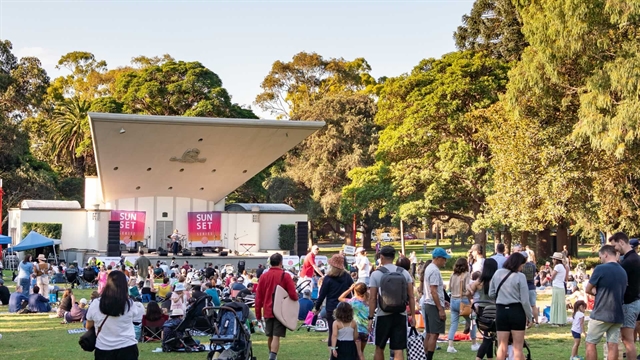 The setting encourages a relaxed evening: families seated on picnic rugs, children running across open grass, and brass melodies carrying through the air as daylight fades.